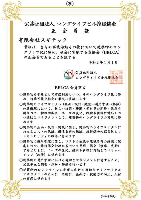 | 加盟団体 | 公益社団法人 ロングライフビル推進協会 [BELCA]正会員 →BELCAとはどんな活動をしている団体? ![]() |