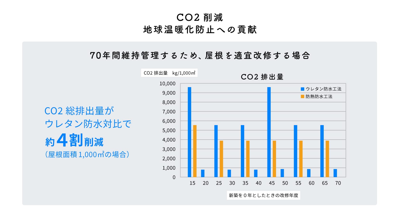 また、撤去・廃棄物を抑えるオーバーレイ工法(既存防水層の上から施工)が可能なため、CO2総排出量も約4割削減できます。環境に配慮した材料と工法で、作業員と居住者の安全を守りながら地球環境保全にも貢献します。