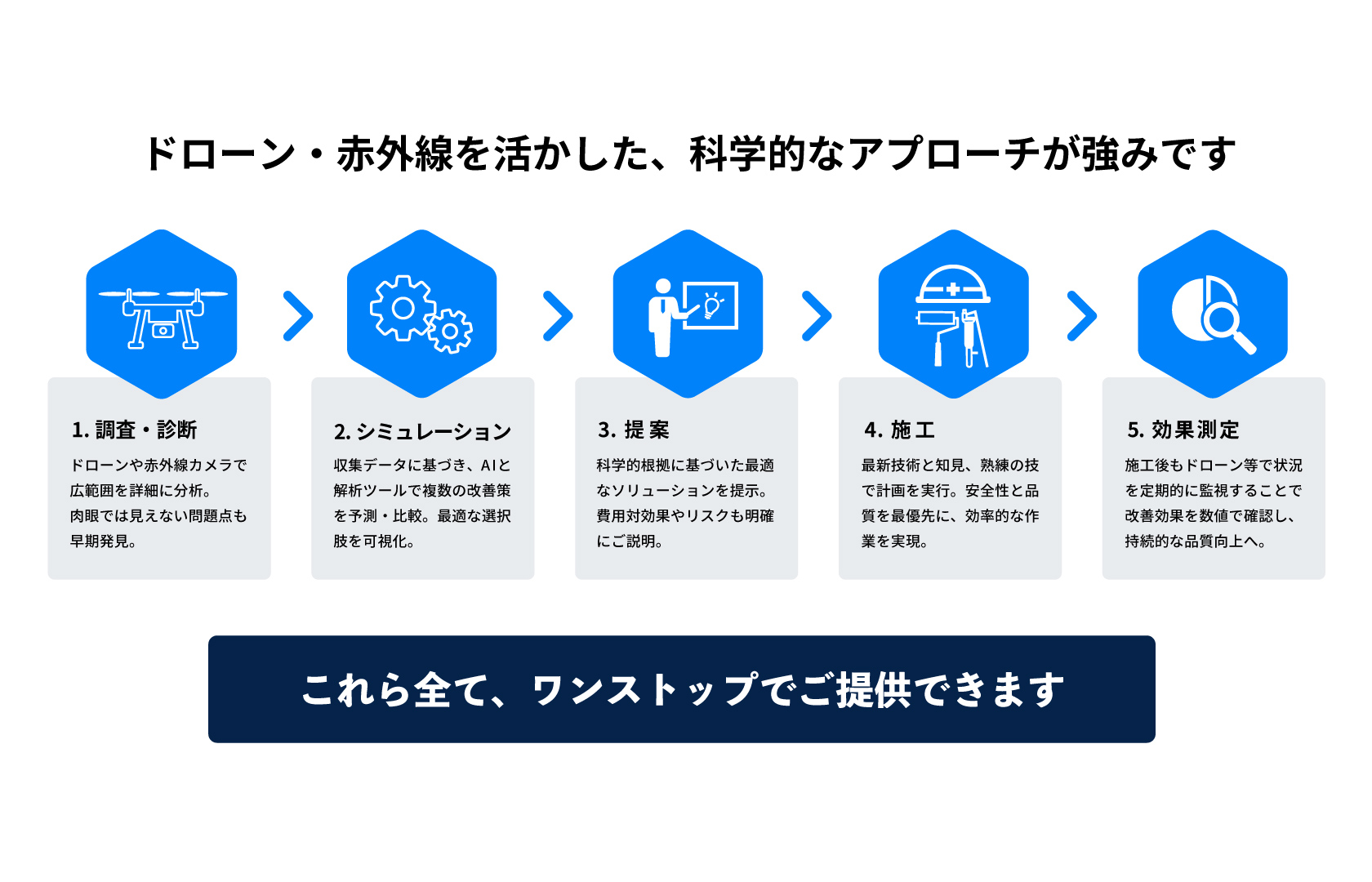 ドローンと赤外線による科学的な劣化診断データを解析し、修繕の優先度とタイミングを予測。