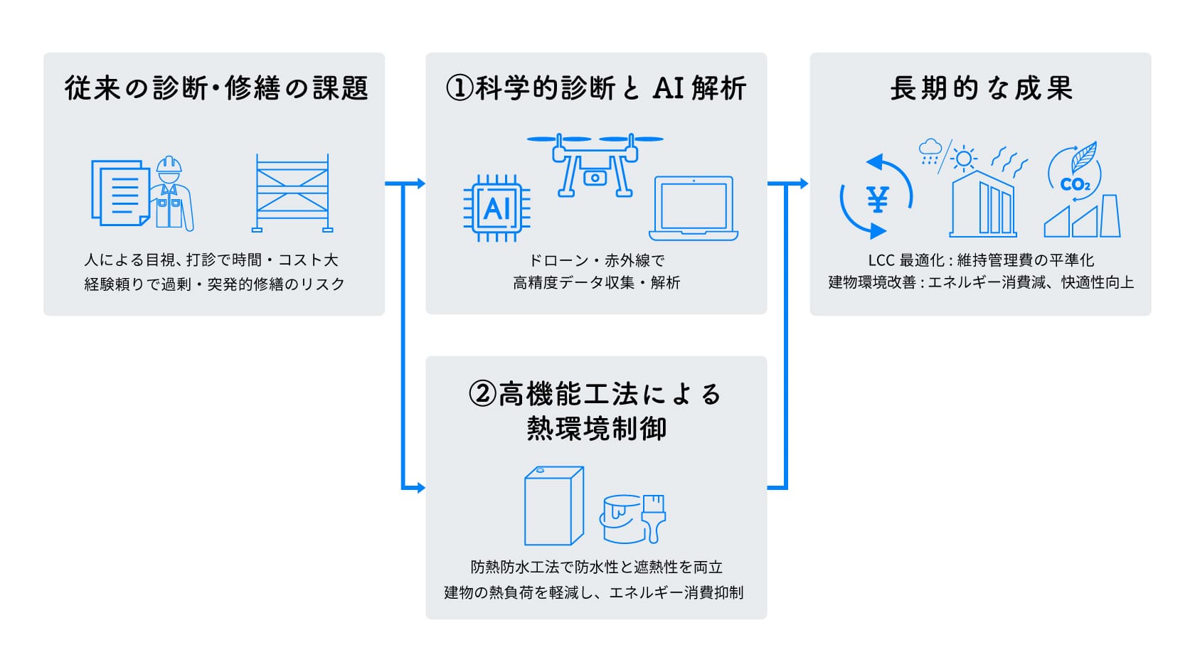 これにより、無駄な修繕を排除しエネルギー消費を抑えることで、長期的な維持管理費の平準化と