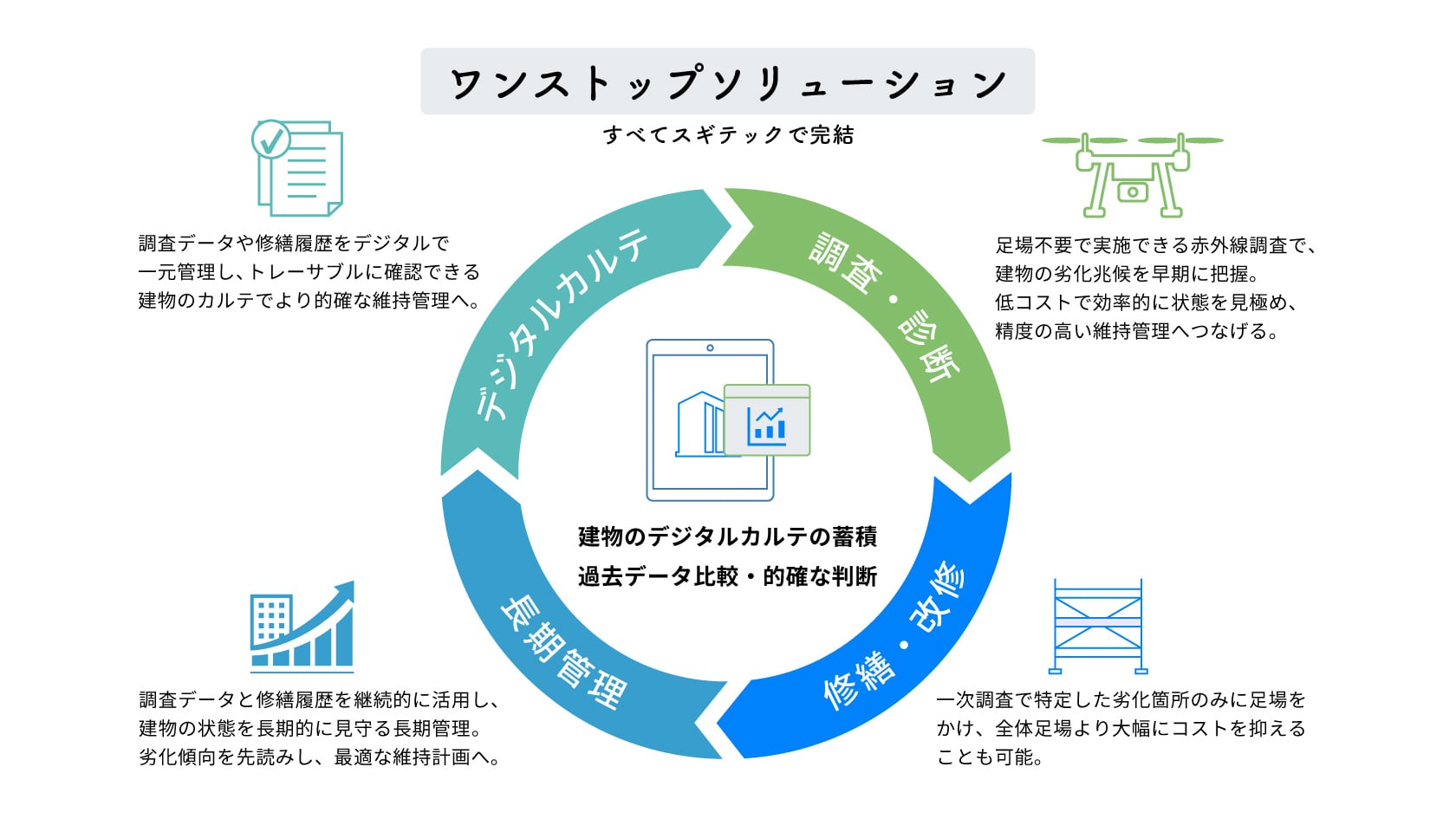 また、正確なデジタルデータ(建物のカルテ)を蓄積し、過去データとの比較による的確な判断を可能にし、建物の長期的な資産価値維持に貢献します。