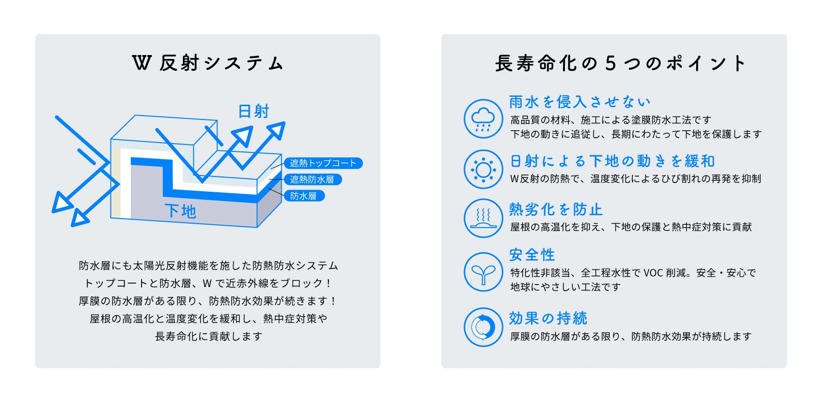当社が採用する防熱防水工法は、従来の防水層に加え、トップコートと防水材の双方に遮熱性能を付与したW反射システムを採用しています。