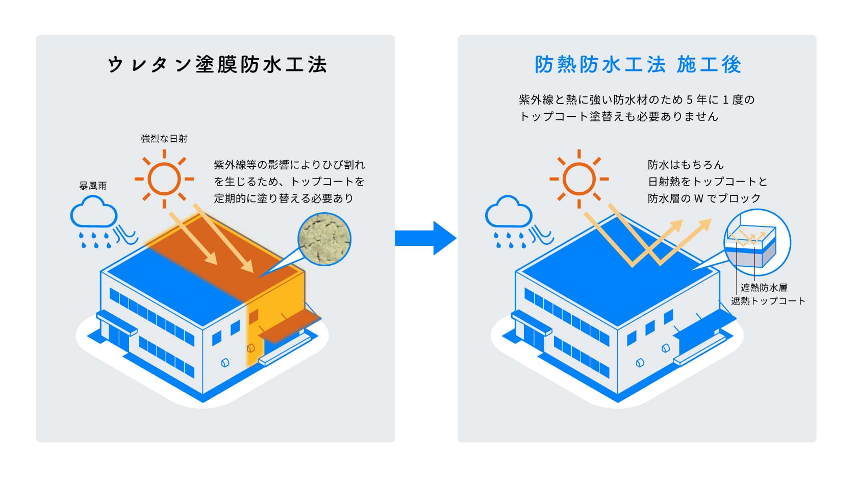建物の防水層は、日中の高温と夜間の低温、そして強い日射による膨張・収縮で常にダメージを受けています。防熱防水工法は、W反射により屋根の高温化自体を防ぐため、防水材の熱劣化を抑制します。
